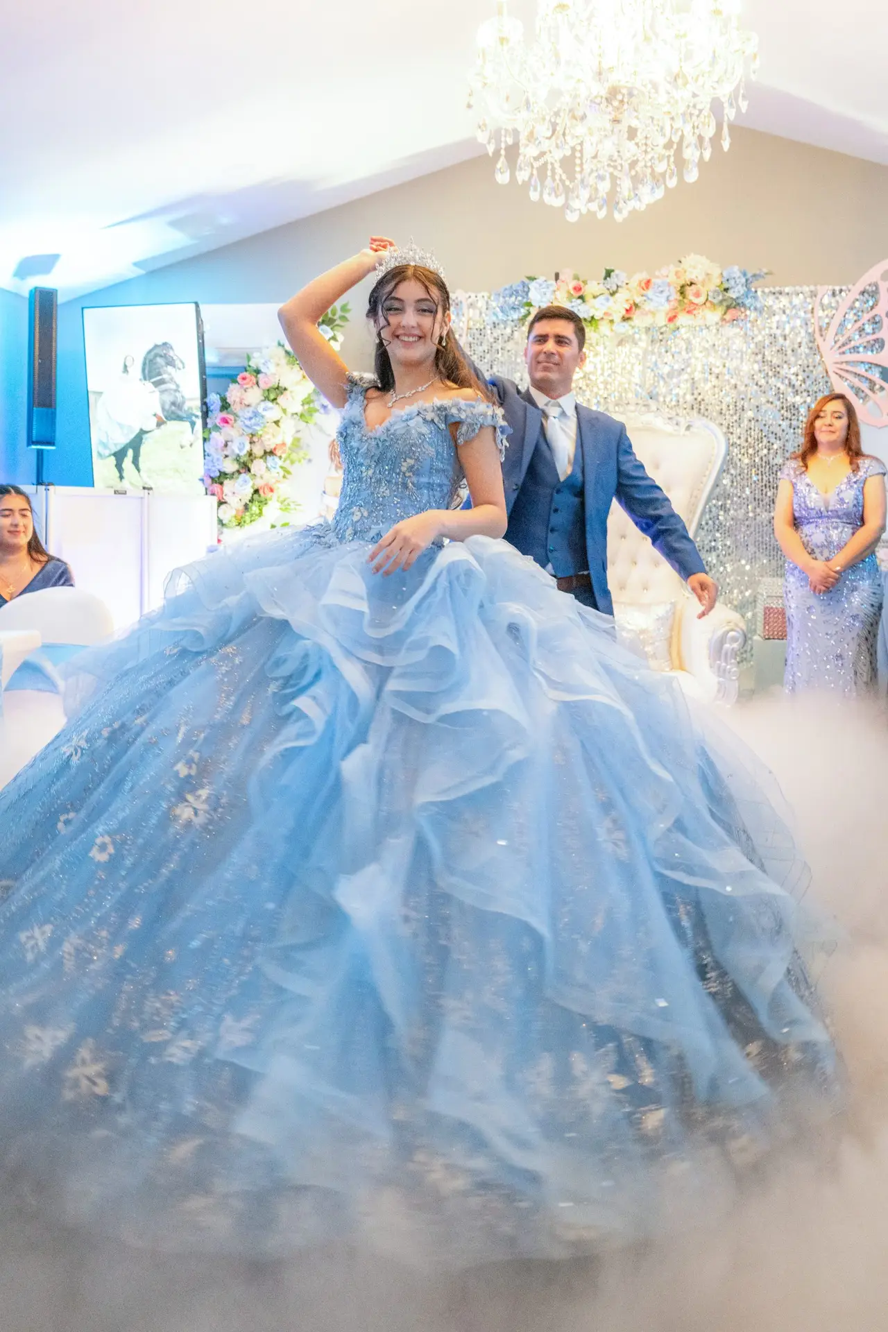 Un fotógrafo de quinceañeras con experiencia también sabrá cómo trabajar en entornos desafiantes. Muchas celebraciones se realizan en salones de banquetes con iluminación tenue, luces LED de colores, máquinas de humo y coreografías rápidas. La experiencia con iluminación de eventos, flash externo y fotografía de alta velocidad es esencial para producir imágenes nítidas y vibrantes que hagan justicia a la energía de la celebración.